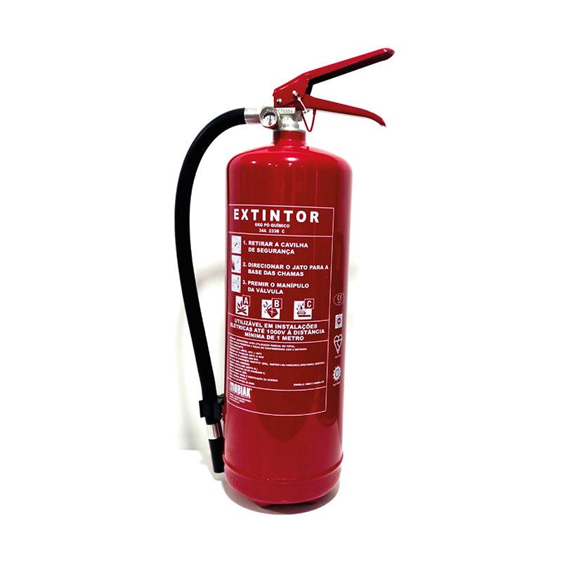 Extintor de polvo químico seco de 6 kg. Válvula de liberación de presión. Soporte metálico de pared. Características: Capacidad: 6 kg Eficacia: 34A 233B C Agente extintor: ZX PD Estándar N Temperatura de funcionamiento: -30 °C a +60 °C Presión máxima: 17 bar Presión de prueba: 30 bar Volumen: 6,72 l Altura del cilindro: 437 ± 2 mm Diámetro del cilindro: 150 ± 2 mm Rosca: 30 ± 1,5 mm Material de la válvula: CuZn40Pb2 Material del cilindro: DC01/DC03 Seguridad de la válvula: 22-27 bar Peso total aproximado: 9,56 kg Dimensiones aproximadas: 160 x 160 x 535 mm Pintura: RAL 3000