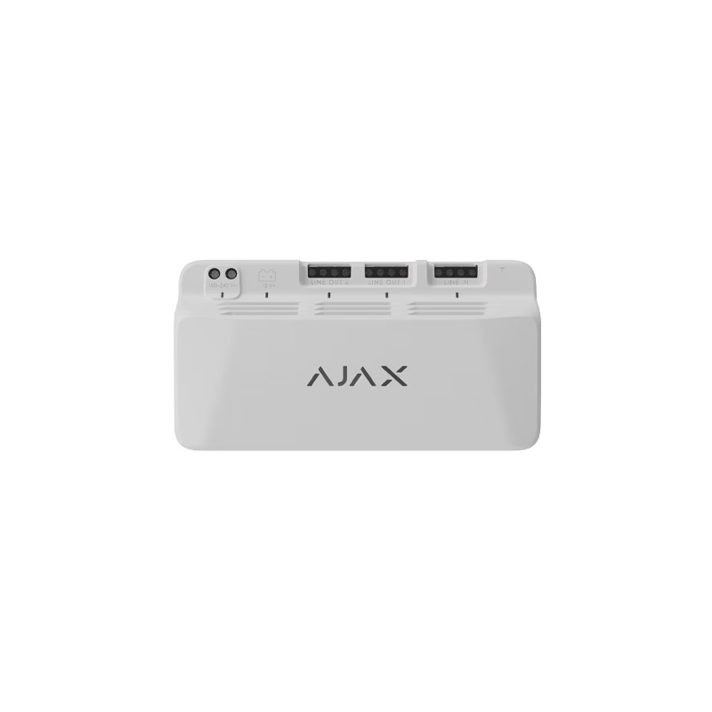 Comunicación Tecnología de comunicación por fibra óptica. Nuestra tecnología de comunicación cableada patentada combina la fiabilidad del cable con la libertad de la conexión inalámbrica. Características principales: . Comunicación bidireccional. . Anti-spoofing avanzado. . Cifrado de bloques con clave dinámica. . Notificaciones instantáneas. . Configuración remota mediante aplicaciones Ajax. Conexión de línea: Cable de 4 núcleos. Conexión a cualquier punto de la línea de fibra óptica. Alcance de la conexión cableada: . Entre el módulo y el concentrador: hasta 2000 m; . Entre el módulo y el último dispositivo de fibra óptica de cada línea: hasta 2000 m. Comunicación cifrada: Todos los datos almacenados y transmitidos están protegidos mediante cifrado de bloques con clave dinámica. Conexión de línea Número de líneas de entrada: 1. Número de líneas de salida: 2. Longitud del cable: hasta 2000 m. Para cada línea de salida entre el módulo y el último dispositivo de fibra óptica de la línea, utilizando cable U/UTP de par trenzado cat. 5. Aislamiento galvánico: Garantiza que los dispositivos conectados entre la fuente de alimentación (75 W) y el extremo de la línea no consuman energía del concentrador. Alimentación Red eléctrica: 100–240 V~, 50/60 Hz Batería de respaldo: 12 V? con una capacidad de 7 a 18 Ah No incluida. Cuando la alimentación principal está disponible, la batería de respaldo se carga desde la red eléctrica. Potencia . Por línea: 30 W; . Para cargar la batería de respaldo: 15 W. Protección antimanipulación Alarma antimanipulación: La fuente de alimentación (75 W) cuenta con un conector para fijar la placa de seguridad al módulo. La placa de seguridad se encuentra en la carcasa, que se vende por separado. Protección contra cortocircuitos en la línea Protección contra sobretensiones en líneas de fibra óptica Protección contra suplantación de identidad y autenticación del dispositivo Detección de pérdida de comunicación tras 36 segundos Carcasa Dimensiones: 160 × 85 × 53 mm Peso: 456 g Temperatura de funcionamiento: -10 °C a +40 °C Humedad de funcionamiento: hasta el 75 % Protección contra descargas eléctricas: Clase III